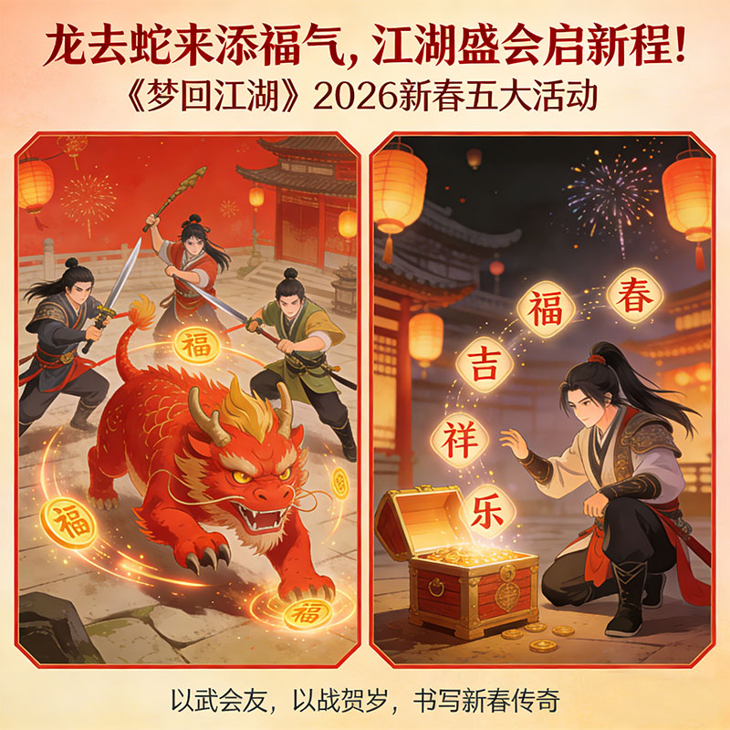 龙去蛇来添福气,江湖盛会启新程!梦回江湖2026 新春五大活动已整装待发,无论是携手好友围猎年兽,还是孤身探宝集字纳福,都能收获满满惊喜。这个新春,让我们以武会友,以战贺岁,在江湖中书写属于你的江湖传奇,共度一个热血与年味并存的欢乐佳节!